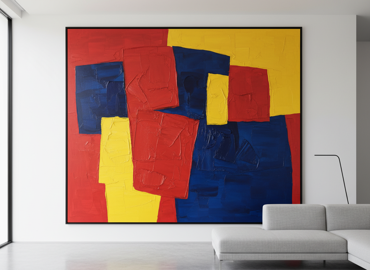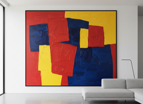 Contemporary abstract artwork professionally framed. Bold colors and patterns create a statement piece for modern homes or creative spaces.
